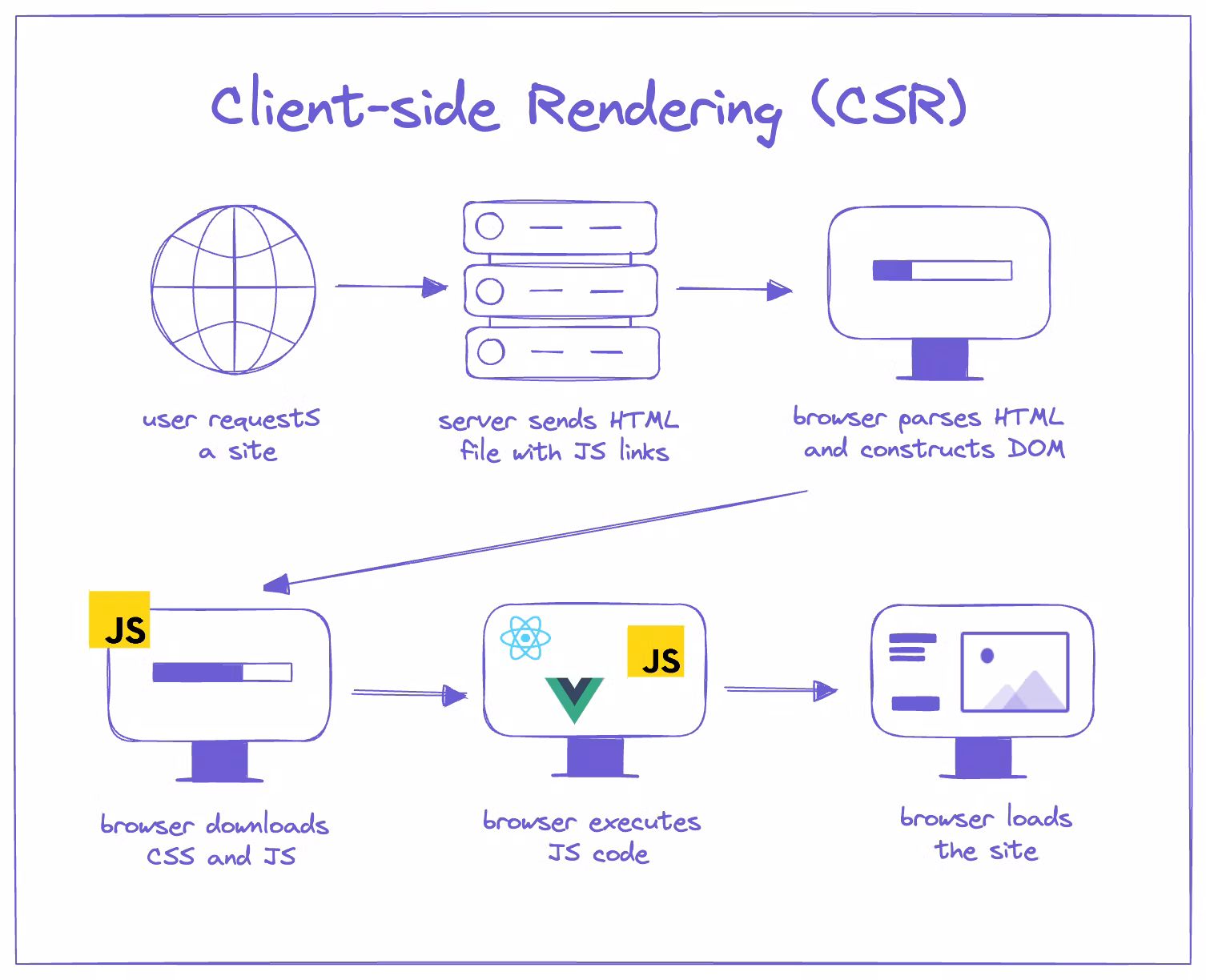 Este modelo tiene como objetivo mejorar la interacción y la experiencia del usuario, ya que permite que las páginas web respondan más rápidamente después de la carga inicial, sin la necesidad de realizar solicitudes constantes al servidor para cada interacción o cambio de página. Una ventaja importante del CSR es que se reduce la carga en el servidor y las aplicaciones pueden ofrecer experiencias más interactivas y fluidas, al manejar gran parte de la lógica de la interfaz directamente en el cliente. Sin embargo, puede requerir más tiempo para la carga inicial, ya que el JavaScript debe descargarse y ejecutarse para construir la interfaz de usuario completa.